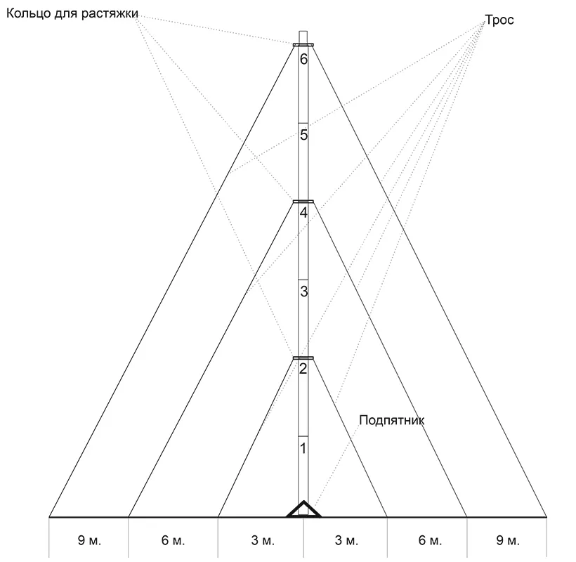 Мачта (6 колен по 1.5 метра), подпятник, метиз для соединения колен, 3 кольца для растяжек (растяжки в комплект не входят)